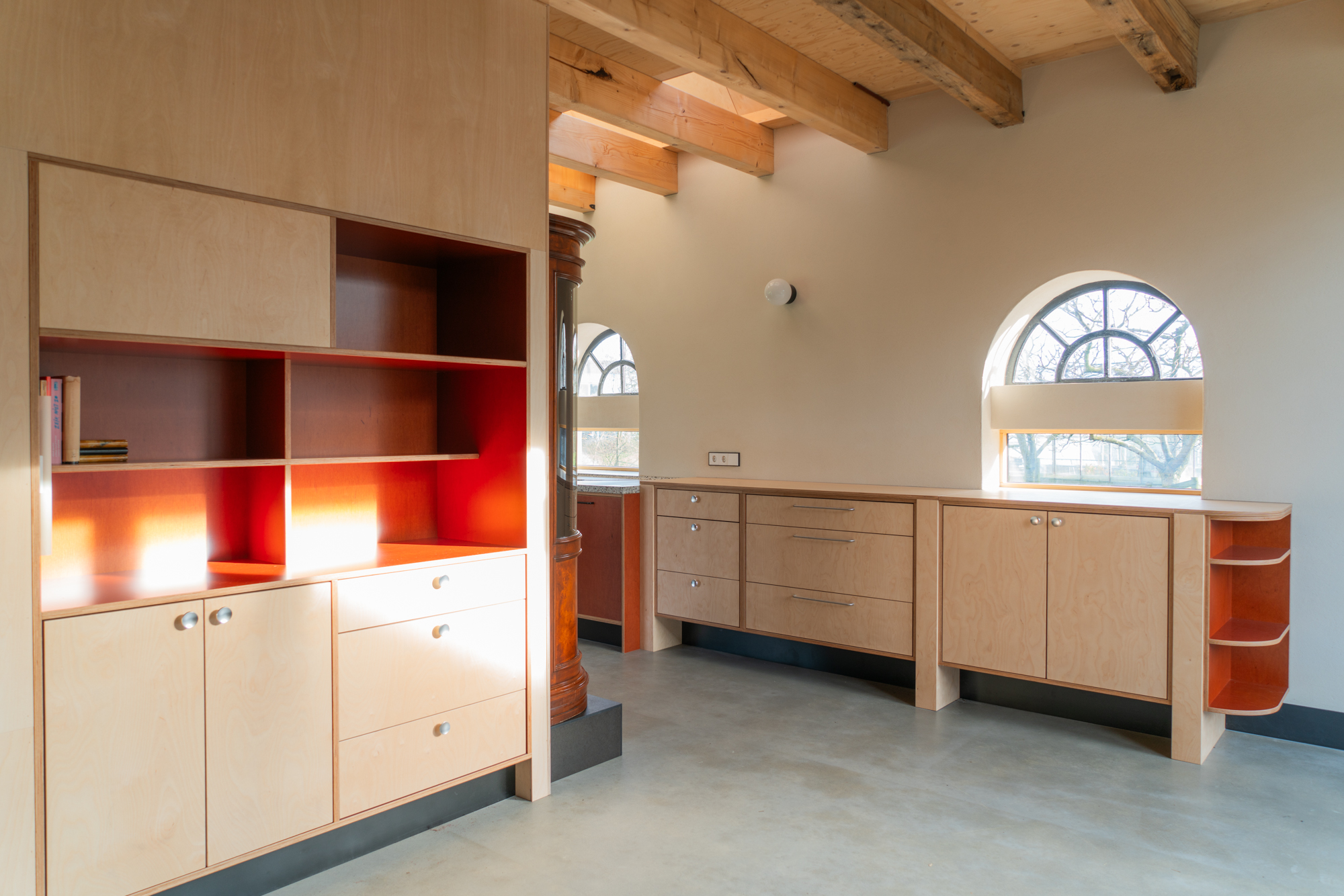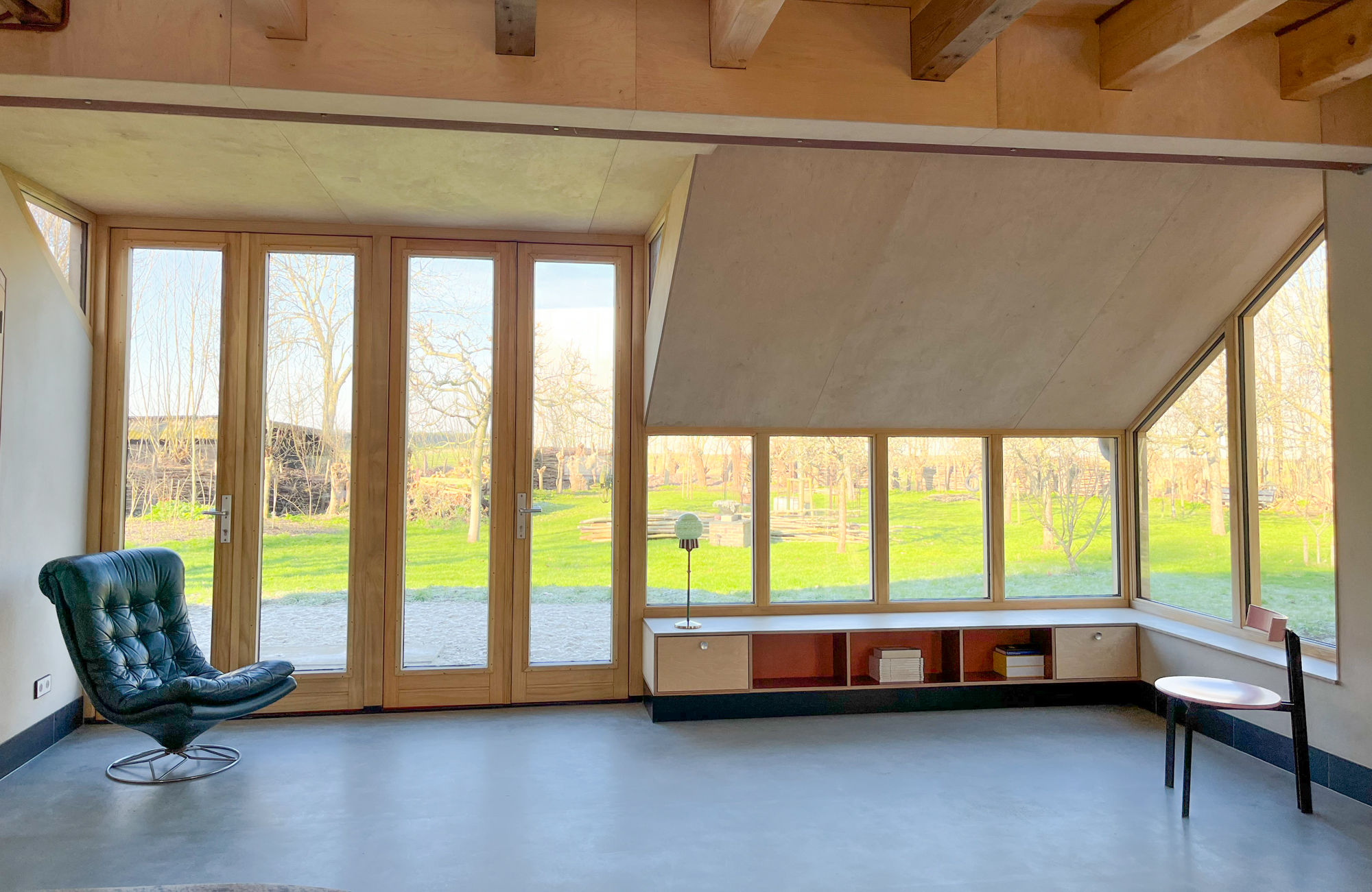 De 19e-eeuwse wagenschuur was jarenlang gebruikt als stalling en moest volledig gerenoveerd worden. In samenwerking met Böhtlingk Architectuur hebben we een ontwerp gemaakt waarbij de originele vorm zoveel mogelijk is behouden en bouwmaterialen zijn hergebruikt. Een lichte tussenruimte verbindt de oude schuur met het nieuwe slaapgedeelte en de buitenruimtes. Dakramen en open plafonds zorgen voor veel natuurlijk licht. Geïsoleerd met natuurlijke materialen hennep en vlas. Voor een goede vocht en warmte regulering zijn de binnenwanden afgewerkt met hout en leem. De trapwand zorgt voor een logische scheiding tussen de verschillende functies van het woongedeelte.